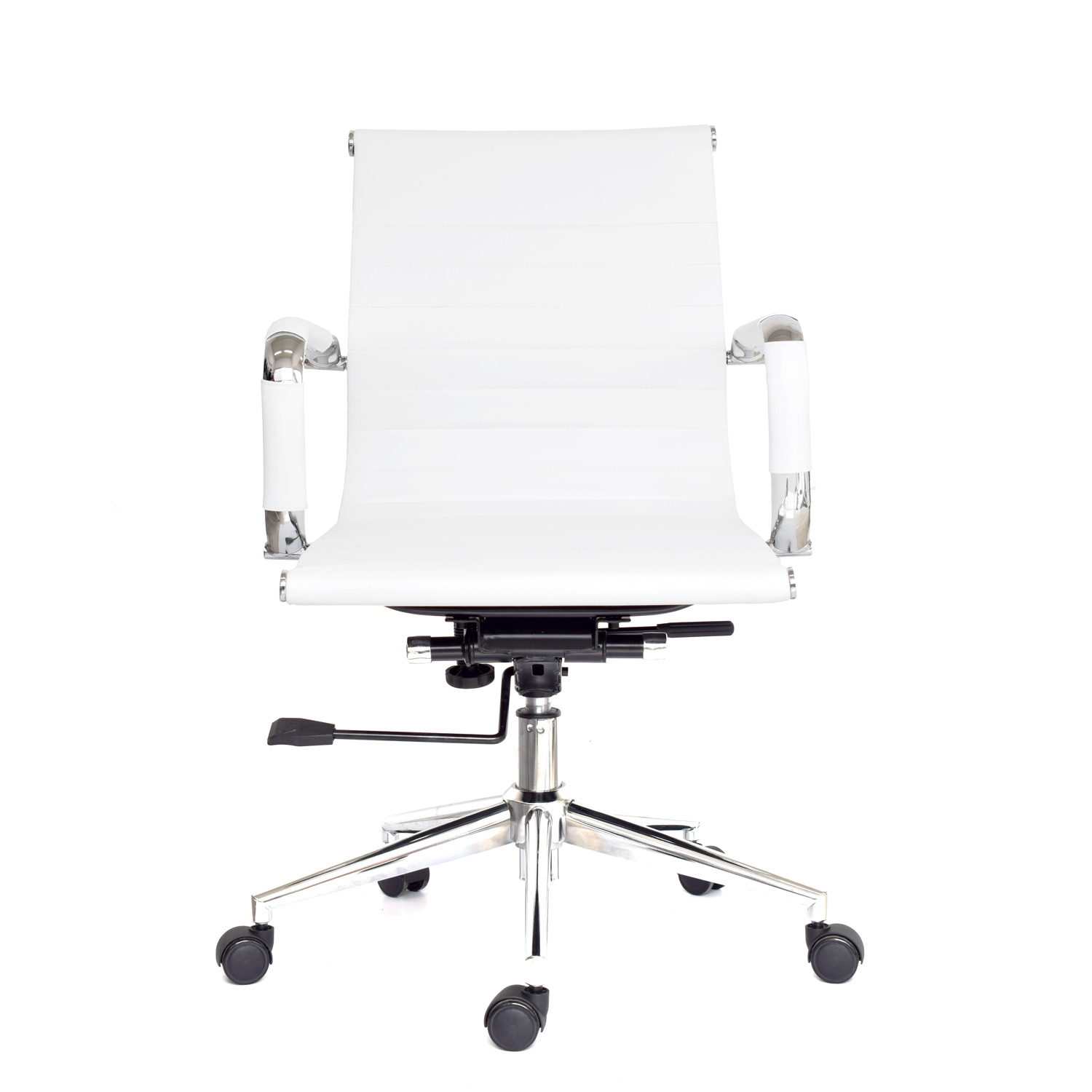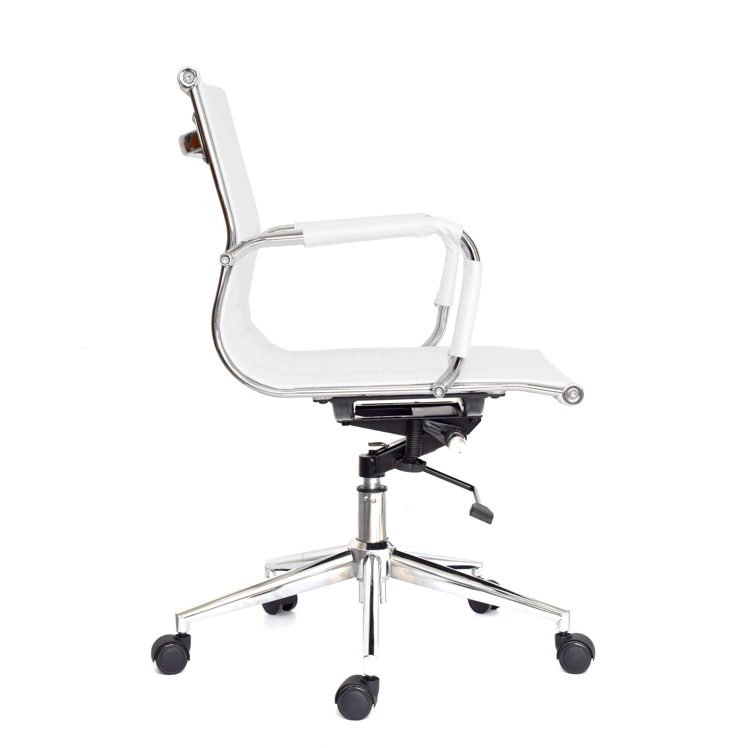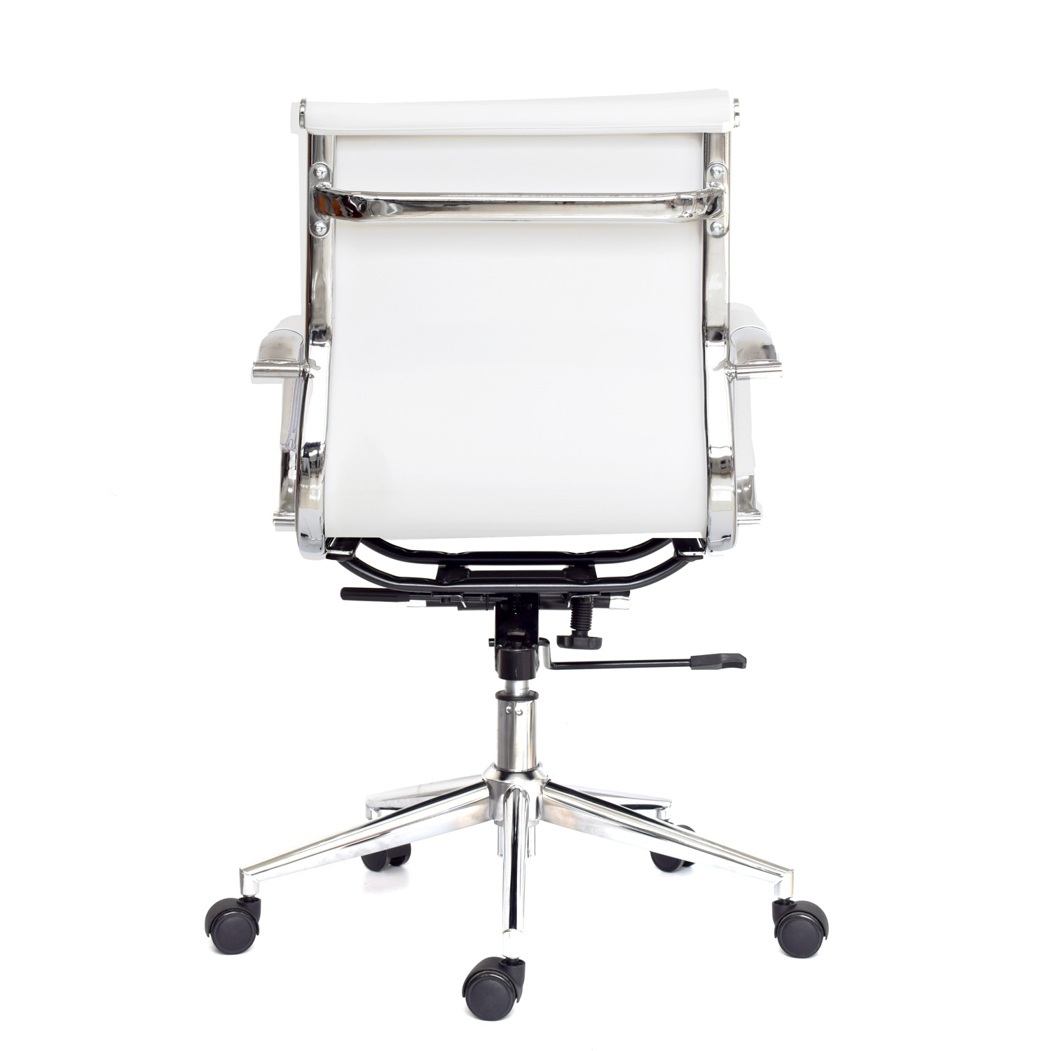 La silla Boss está disponible en versiones con espaldar medio o alto. Su espaldar y asiento están tapizados en cuero sintético, complementados por un marco cromado que realza su apariencia profesional. Los brazos cromados fijos con cobertor en cuero sintético añaden confort y elegancia. Incluye un mecanismo basculante con 1 posición de bloqueo y perilla de tensión, además de una base cromada de 320 mm y ruedas de goma para un desplazamiento fluido.