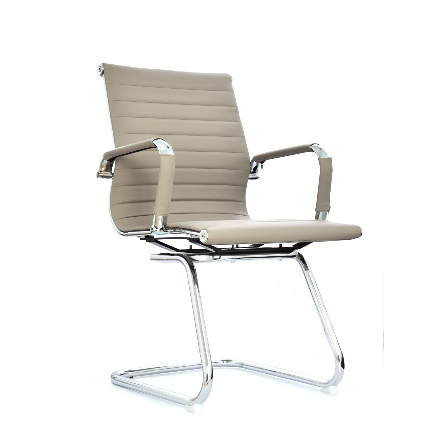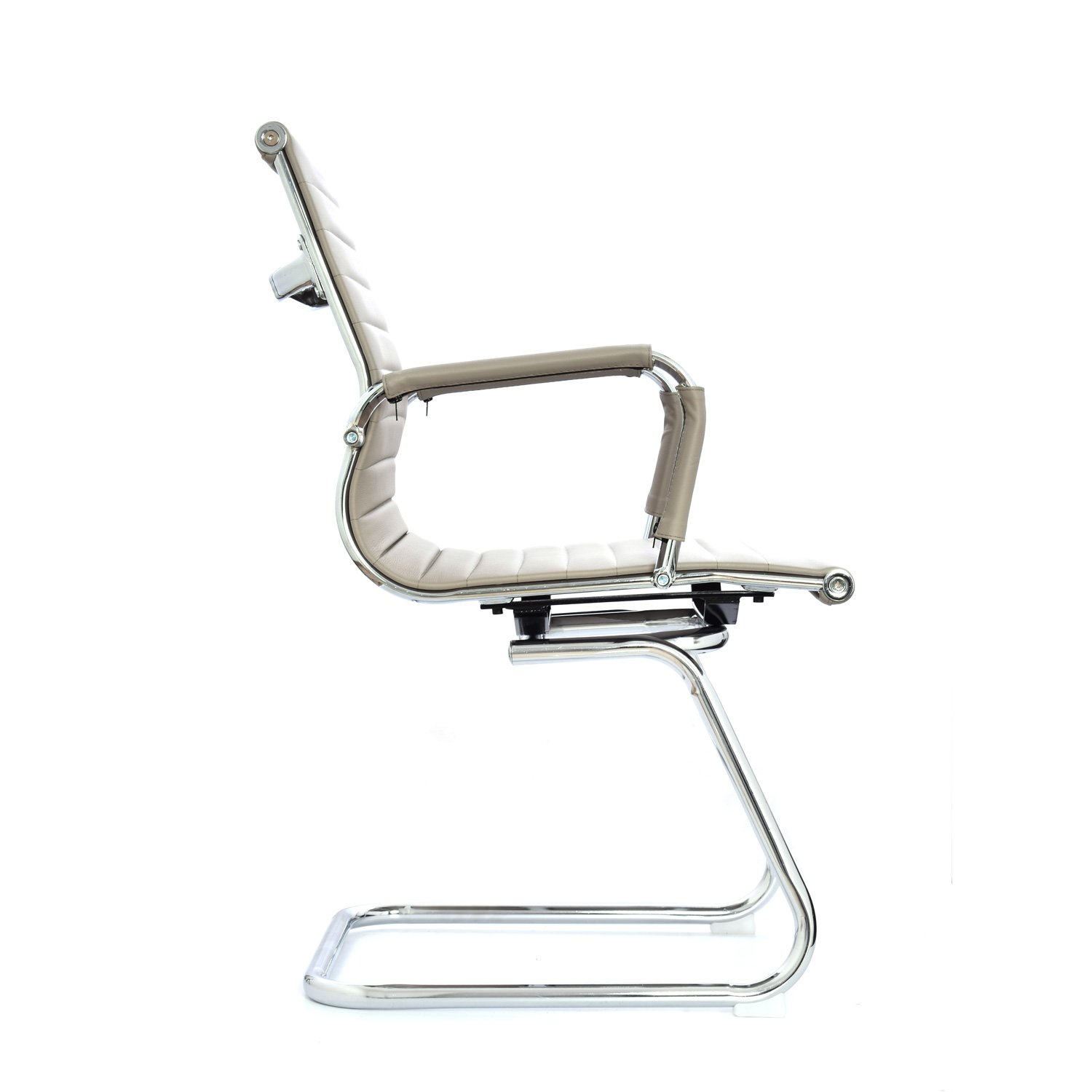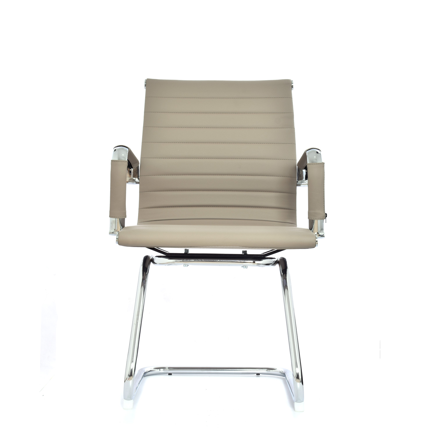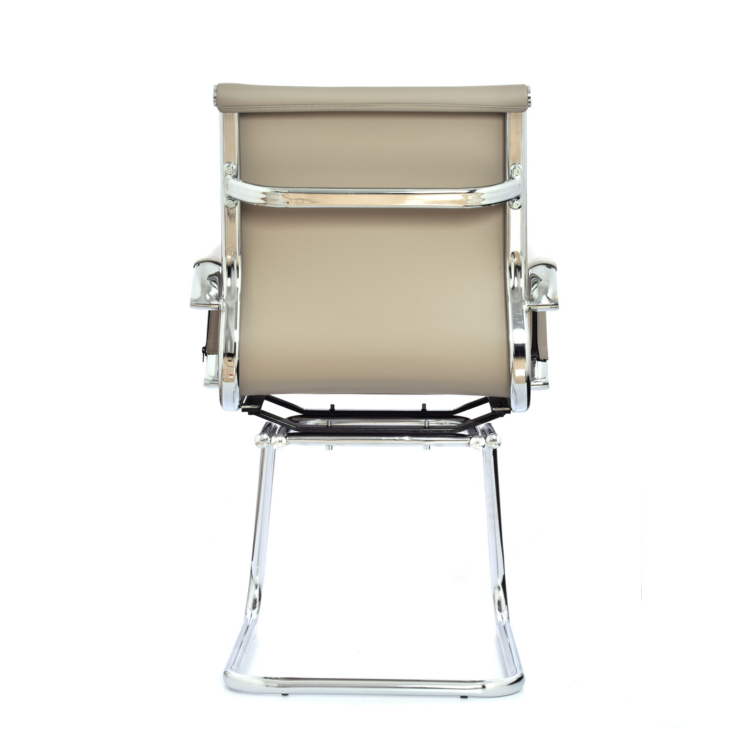 Espaldar y asiento tapizados en cuero sintético con marco cromado, ofreciendo confort y durabilidad.