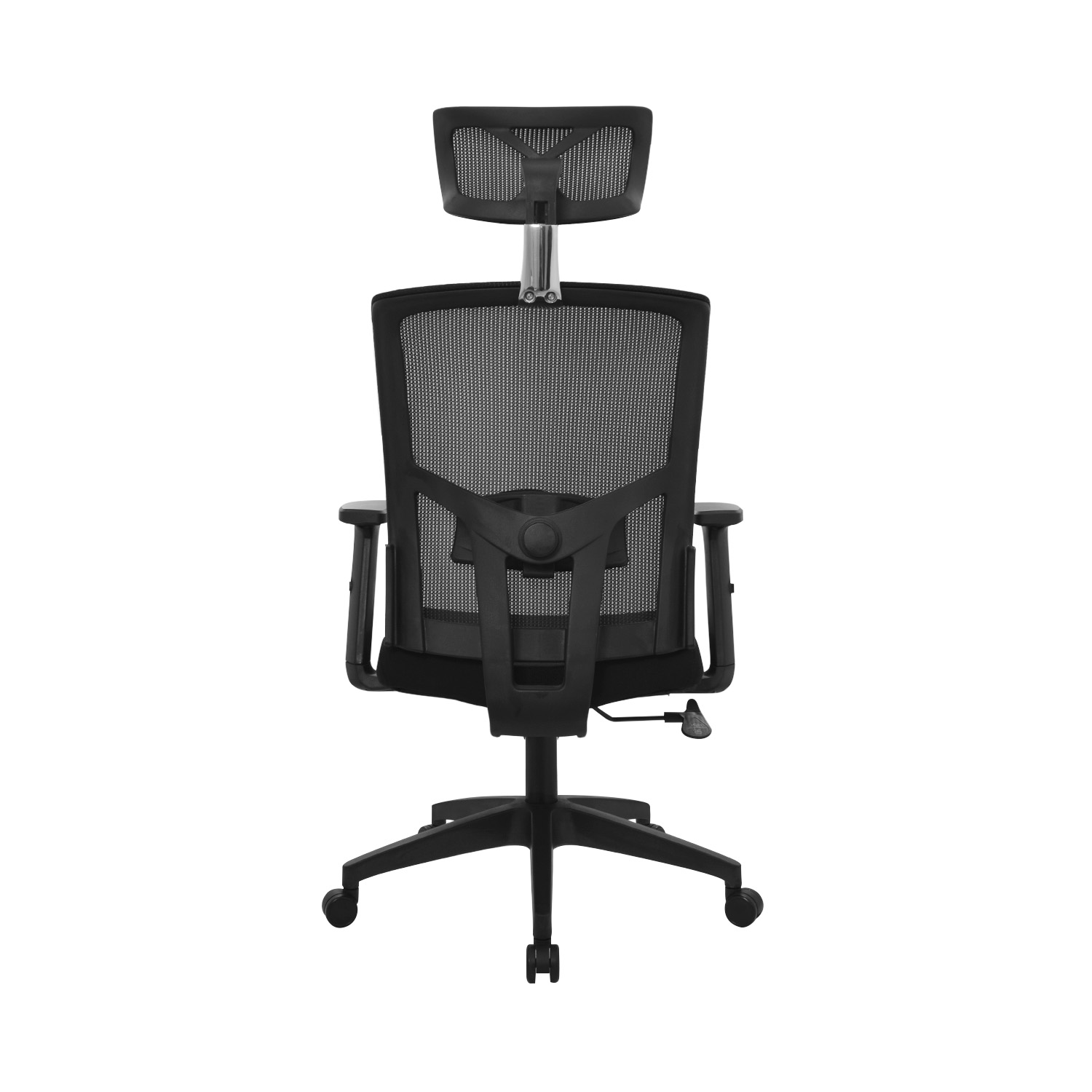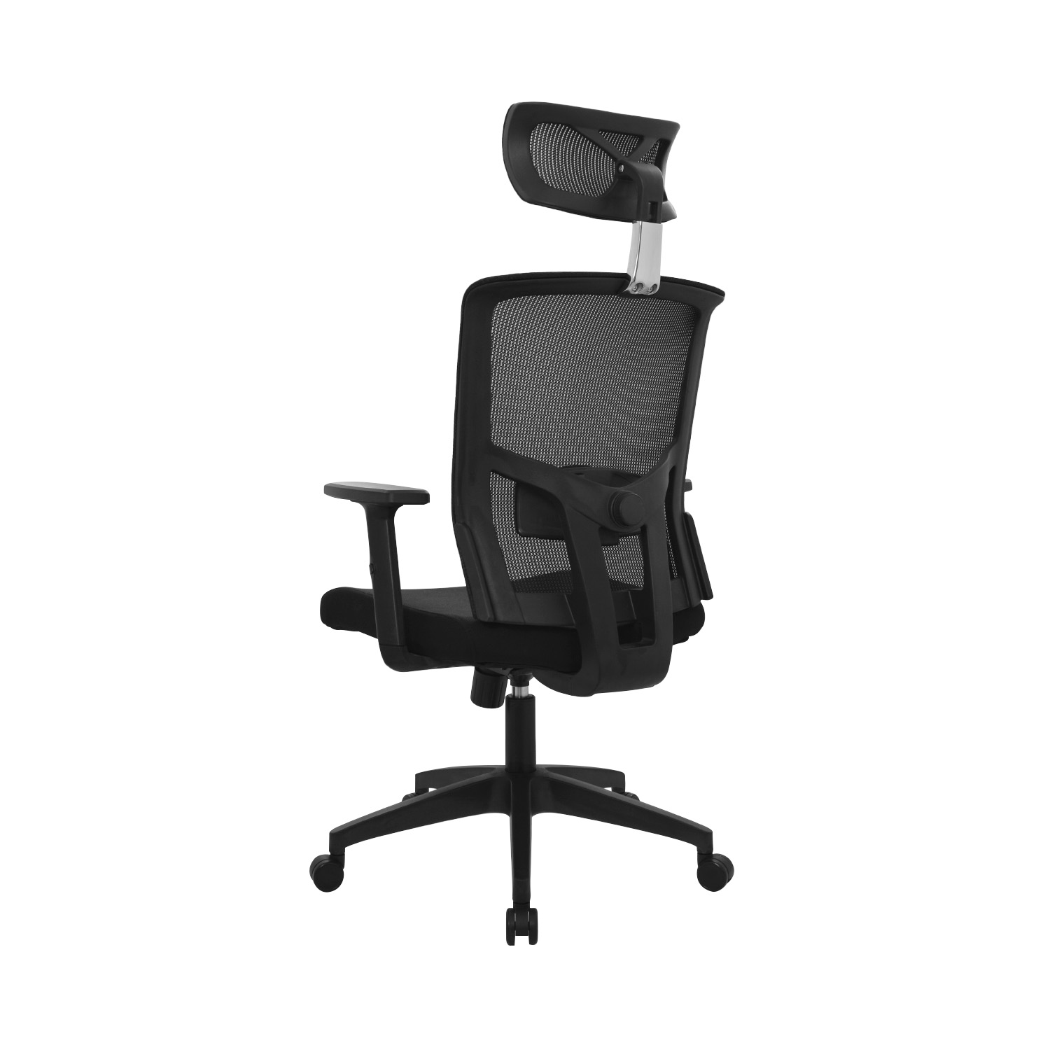 Opción de cabecero en malla regulable en altura y ángulo para soporte ergonómico.