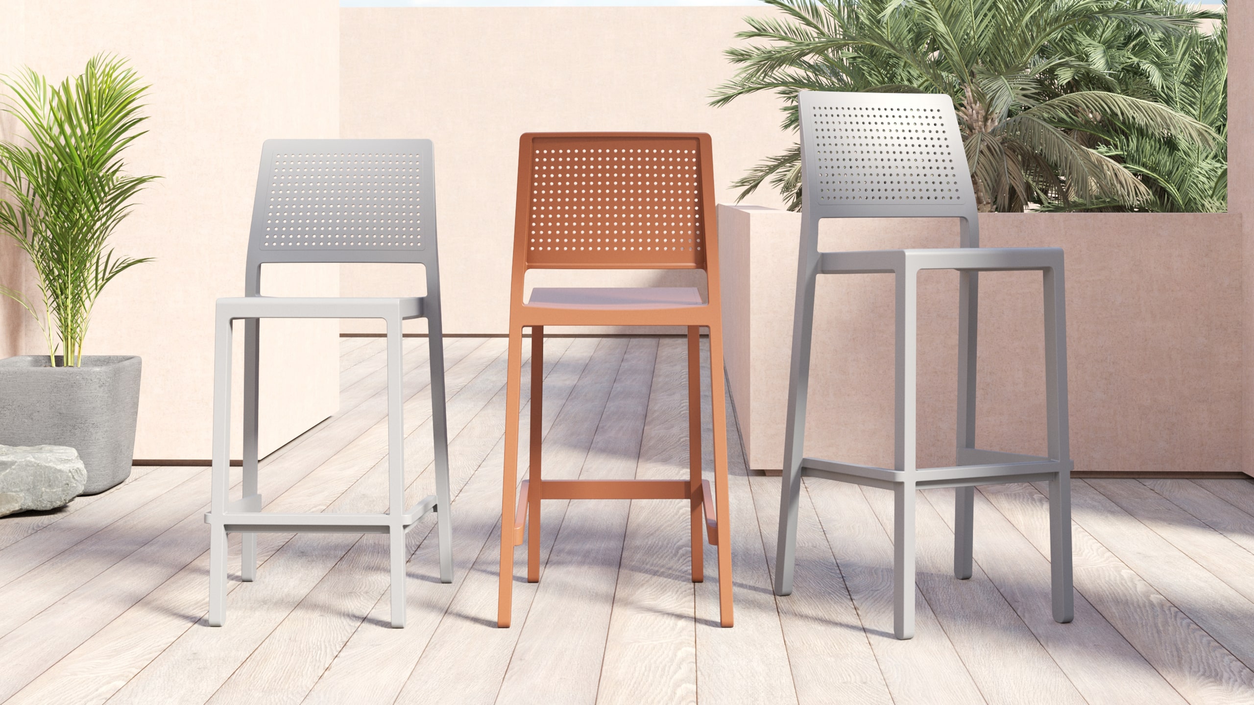 El butaco Emi es un monobloque en tecnopolímero reforzado con fibra de vidrio convirtiéndola en una opción resistente, es apilable en hasta 4 unidades. Su espaldar es microperforado para mayor ventilación. Filtro UV para uso exterior ideal para resistir el sol, su estructura es de 4 patas cuenta con opciones de altura 75cm y 65cm.